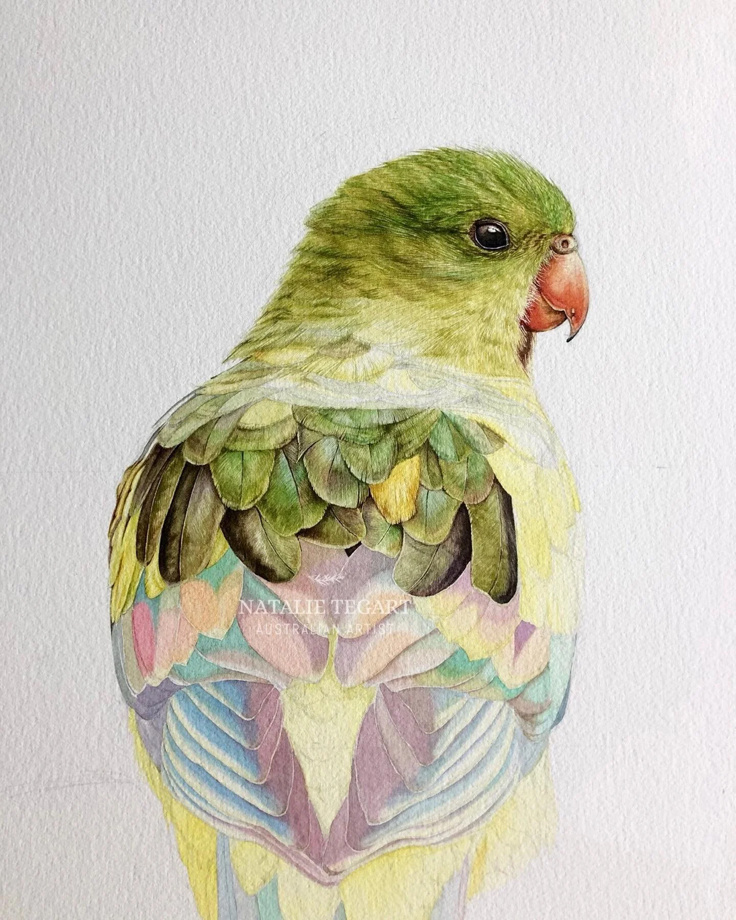 I’m so pleased to finally share with you all my newest addition to my Native Australian Birdlife Collection. Colour, charisma and detail are celebrated in this piece as we see a young bird grow into his adult feathers. He’s fluffy, curious and a bit cheeky! Love him? Check back this Saturday to purchase!